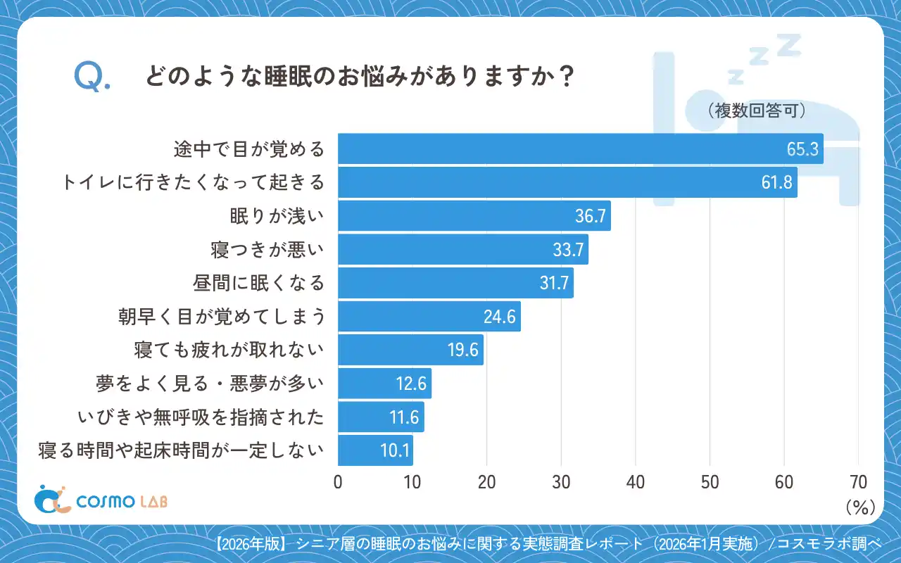 睡眠の悩みでは、「途中で目が覚める」(65.3%)と「トイレに行きたくなって起きる」(61.8%)が多く挙がりました。 |