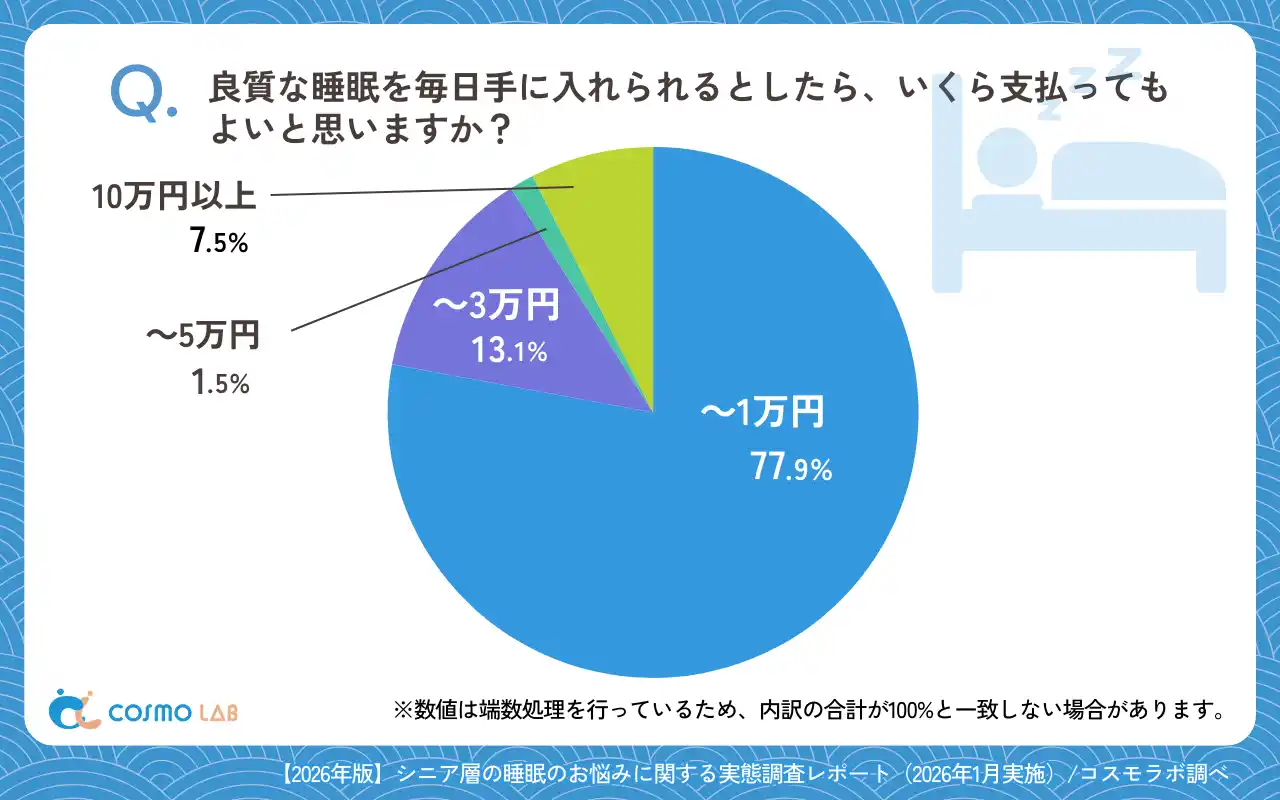 良質な睡眠を毎日得られる場合に、そのサービスや商品に対していくら支払えるかでは、「~10,000円」(77.9%)が大半を占めました。 |