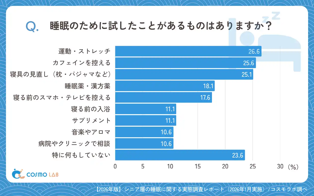 睡眠の改善に向けて試したことでは、「運動・ストレッチ」(26.6%)、「カフェインを控える」(25.6%)、「寝具の見直し(枕・マットレス・布団・パジャマなど)」(25.1%)がほぼ同程度で並びました。 |