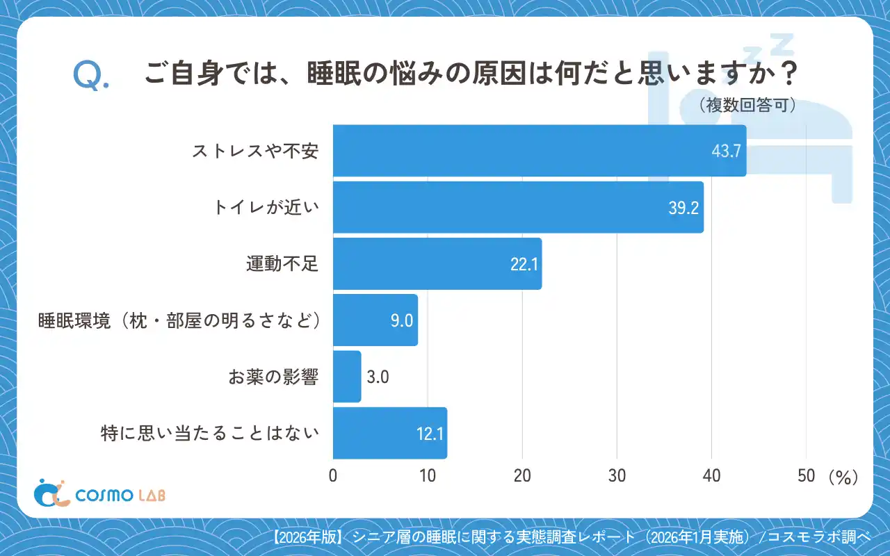 睡眠の悩みの原因として、「ストレスや不安」(43.7%)と「トイレが近い」(39.2%)が上位となり、心理面や生活習慣に関わる要因が中心であることが分かります。「運動不足」(22.1%)も一定割合で挙げられており、日中の活動量や生活リズムが睡眠に影響している可能性も考えられます。