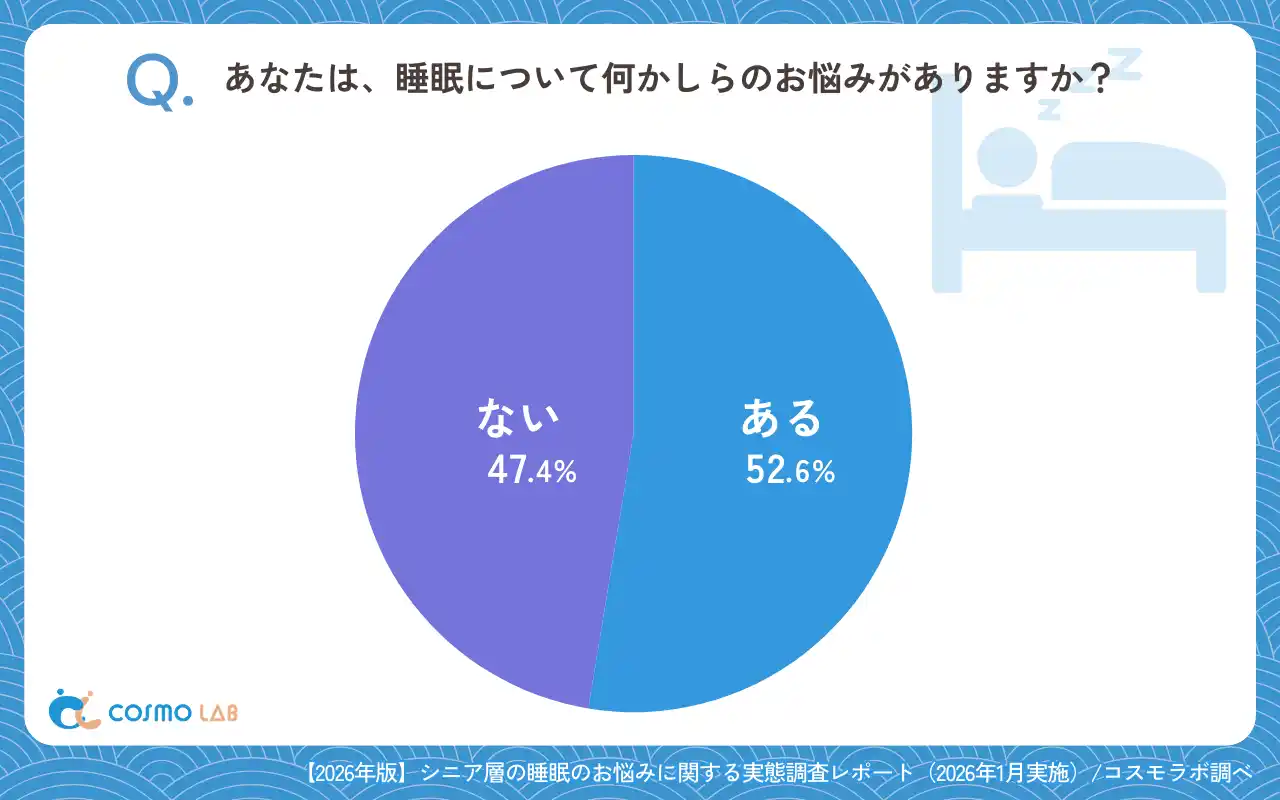 本調査では、睡眠の悩みが「ある」(52.6%)と回答した層が過半数を占めました。そのため、多くのシニアにとって、睡眠が日常的な課題となっている様子がうかがえました。 |