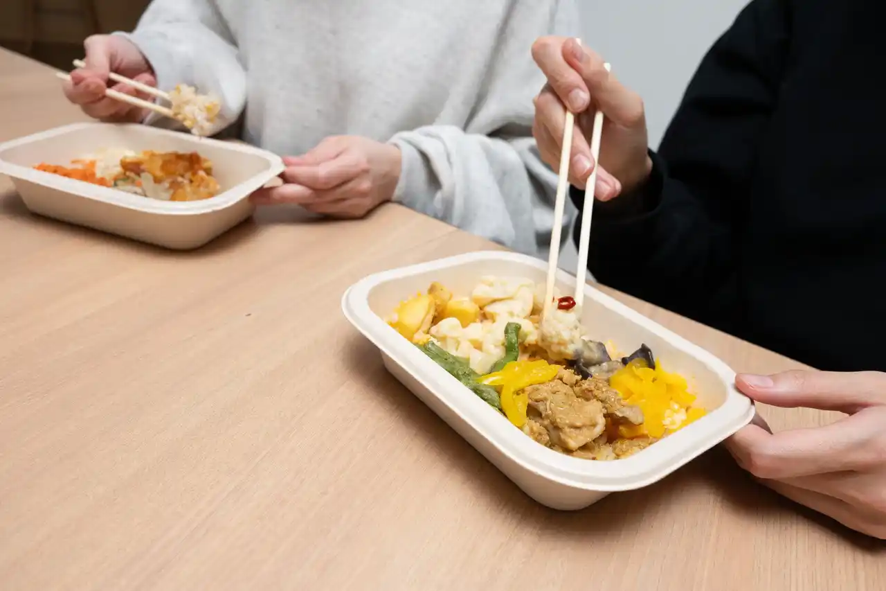 (2)特長:まぜご飯とおかずが一つになった冷凍弁当をオフィスの専用冷凍庫に常備する、一食完結型の置き型社食(R)︎サービスです。忙しいビジネスパーソンが「仕方なくオフィスで食事を済ませる」のではなく「忙しいときこそあえて、オフィスで食べたくなる」ような、栄養バランスと満足感を追求した食事を時間や場所を制限されることなく提供します。専用冷凍庫の貸与のほか、専任スタッフによる活用支援等がサービスに含まれており、導入後の定着や運営をサポートします。 |