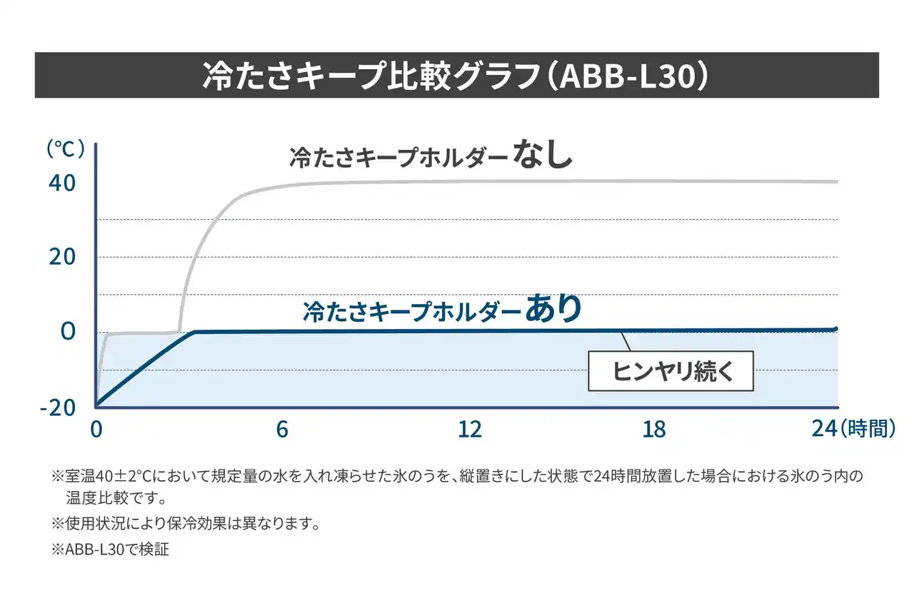 左のグラフは、約40℃の環境下で、氷のうを魔法瓶構造の冷たさキープホルダーに入れ続けた場合には、氷のう内の温度が24時間後も約0℃に保たれていることを表します。 |