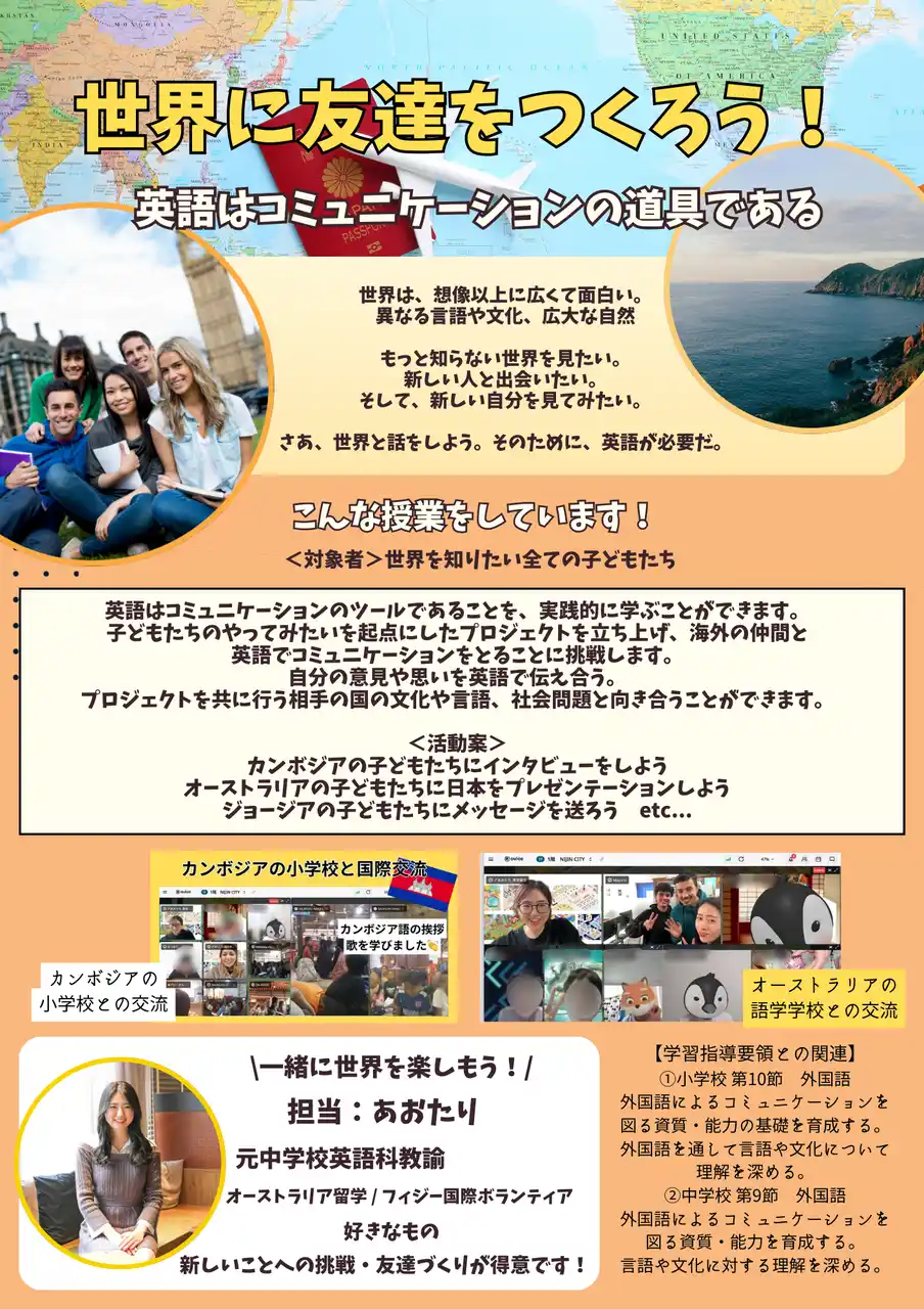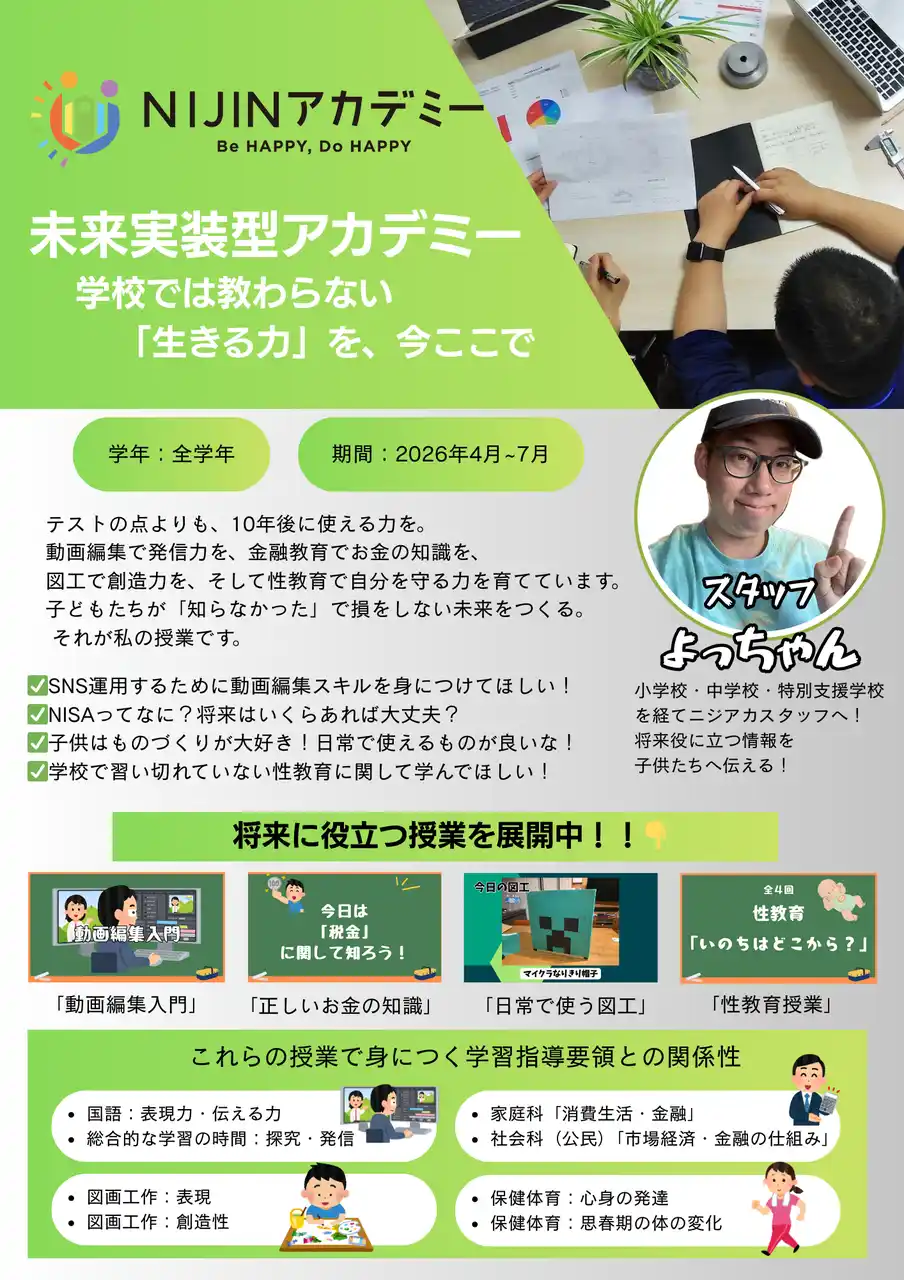 株式会社NIJIN(本社:東京都江東区、代表取締役:星野達郎)が運営する不登校オルタナティブスクール『NIJINアカデミー』は、2026年度4月期の新シラバスを公開しました。本シラバスは、単なる知識の習得に留まらず、SDGs、金融教育、国際福祉、プロジェクト学習など、「10年後、社会で生きていくために本当に必要な力」を身につけるための実践的プログラムです。元公立校教員や海外経験豊かなスタッフが、「誰が、どんな想いで」教えるかを可視化し、子どもたちの主体的な学びを支えます。 |