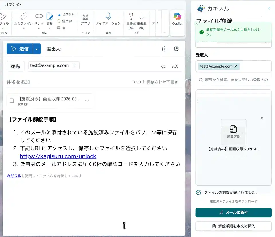 Outlookの下書き画面からカギスルのアドインパネルを開くと、To/Cc/Bccに入力した宛先がそのまま受取人として自動反映されます。ファイルを選択して施錠ボタンを押すだけで、暗号化されたファイルがメールに添付されます。ブラウザを開いたり、別のアプリケーションに切り替えたりする必要はありません。 |