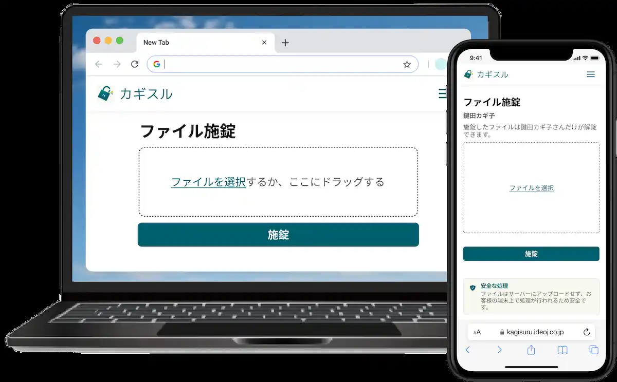 カギスルは、相手のメールアドレスを指定するだけで、その相手のみが開封できるようにファイルを暗号化(施錠)できるサービスです。受信者の事前アカウント作成は不要で、メール添付・ビジネスチャット・クラウドストレージなど、あらゆる送信手段で暗号化ファイルを共有できます。 |