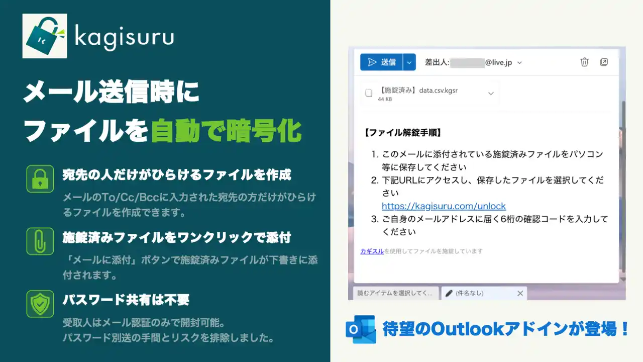 株式会社IDEOJ(本社:東京都渋谷区、代表取締役:野秋 裕己、以下「IDEOJ」)は、パスワードレスのファイル暗号化サービス「カギスル」のMicrosoft Outlook アドインを、Microsoft AppSource(旧 Office ストア)にて公開しました。Outlookのメール作成画面から直接ファイルを暗号化・添付でき、パスワード付きZIPの送付(いわゆるPPAP)を"メールの操作だけ"で置き換えることが可能になります。 |