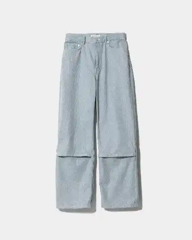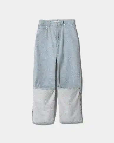 | 膝から裾までが太いワイドストレートシルエットの5ポケットデニムパンツ。ひざ下の切替えを脇と股下で互い違いに縫い合わせた構造パターンが特徴です。裾を裏表ひっくり返すことで、インサイドアウトのバイカラーに変化します。裾をターンアップしたかのようなトロンプルイユデザインとしても着用が可能。 | |||||||||