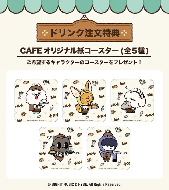 ■ドリンク注文特典:CAFEでドリンクメニューをご注文された方にご希望するキャラクターの「オリジナルコースター(全5種)」を1品につき1枚プレゼント。 |