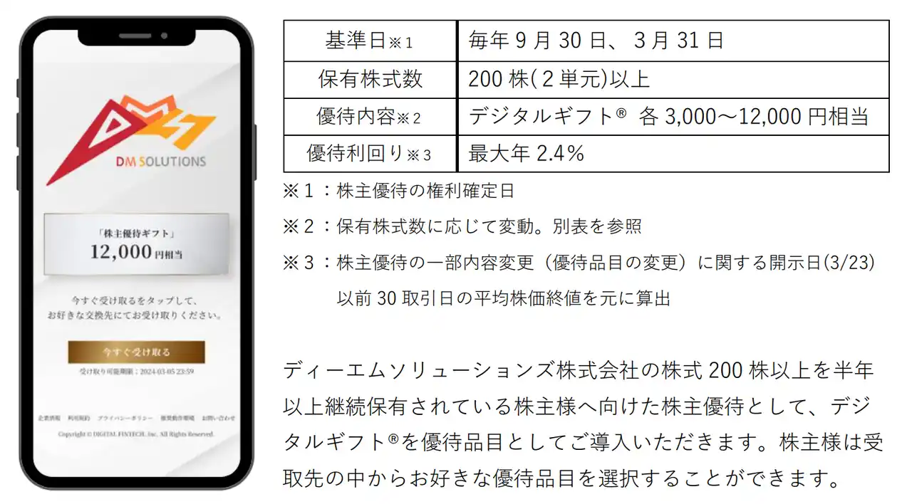 | ディーエムソリューションズ株式会社(代表取締役社長:花矢 卓司、東証スタンダード:証券コード 6549)において、株式会社デジタルプラス(代表取締役社長:菊池 誠晃、本社:東京都渋谷区、東証グロース市場:証券コード3691)グループが運営する「デジタルギフト(R)」を株主優待としてご活用いただくことになりました。 | ||||||||||||||
