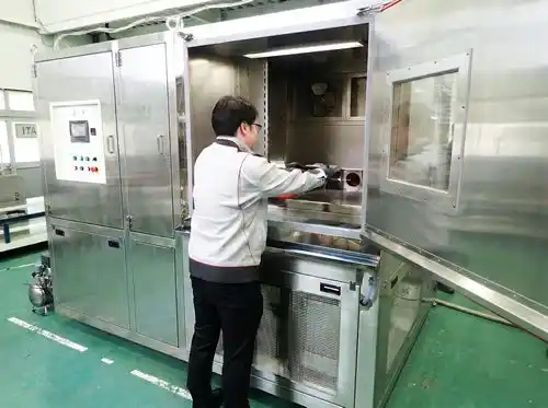 自動化したスプラッシュウォーター試験機へ試料をセットしている様子 |
