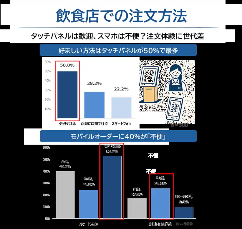 好ましい注文方法はタッチパネルが50.0%で最多。若年層ほど“デジタル注文”に適応 |