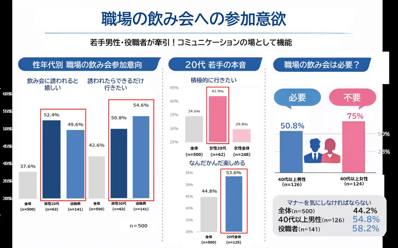 今回の調査から、職場の飲み会は一様に縮小しているのではなく、世代や性別、立場によって価値の捉え方が分かれていることが明らかになりました。 |