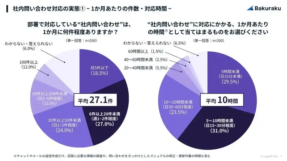すべての経済活動のデジタル化を目指す株式会社LayerX(本社:東京都中央区、代表者:代表取締役CEO 福島良典、以下「LayerX」)は、従業員からの業務進行やツールの使い方などの質問に対応する(以下、「社内問い合わせ」)バックオフィス担当者(総務、人事・労務、経理・財務、法務、情報システム部門の担当者)200名を対象に、社内問い合わせ対応に関する実態調査を実施しました。 |