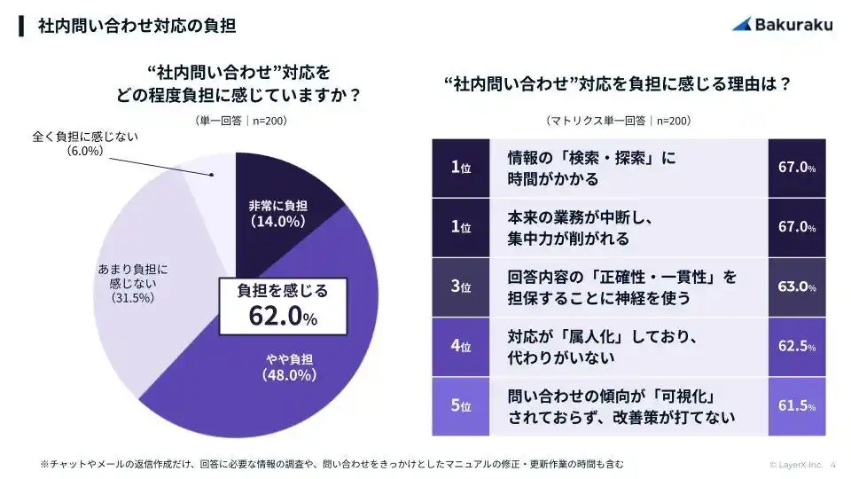 バックオフィス担当者の62.0%が社内問い合わせ対応を「負担」と回答。負担を感じる理由は「情報の検索(67.0%)」と、「本来業務が中断され、集中力が削がれる(67.0%)」が同率1位 |