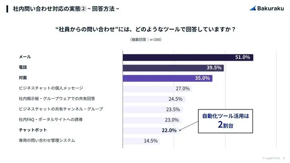 “社内問い合わせ”に対応するツールを質問したところ、1位は「メール」(51.0%)、次いで「電話」(39.5%)、「対面」(35.0%)でした。また、「チャットボット」による自動化ツールを活用していると回答したのは22.0%となりました。 |