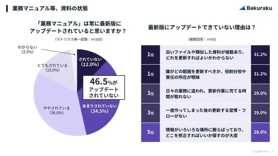 半数近くがマニュアルを最新版に更新していない。原因は「責任所在の曖昧さ」と「類似資料の混在」 |