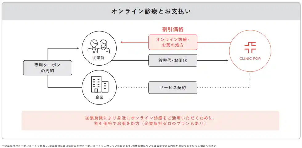 CLINIC FOR WORKでは、オンライン診療を活用し、従業員の健康維持と業務パフォーマンス向上の両立を支援しています。オンライン診療であるため、「忙しくて病院に行けない」「通院が多く業務に支障が出る」といった現場の課題を解消し、必要な医療に迅速かつ途切れずアクセスできる環境を整えることが可能です。また、保険診療から、低用量ピルなどの女性特有の不調に対する自費診療まで幅広く対応し、企業の健康経営を医療の側面から支えています。 |