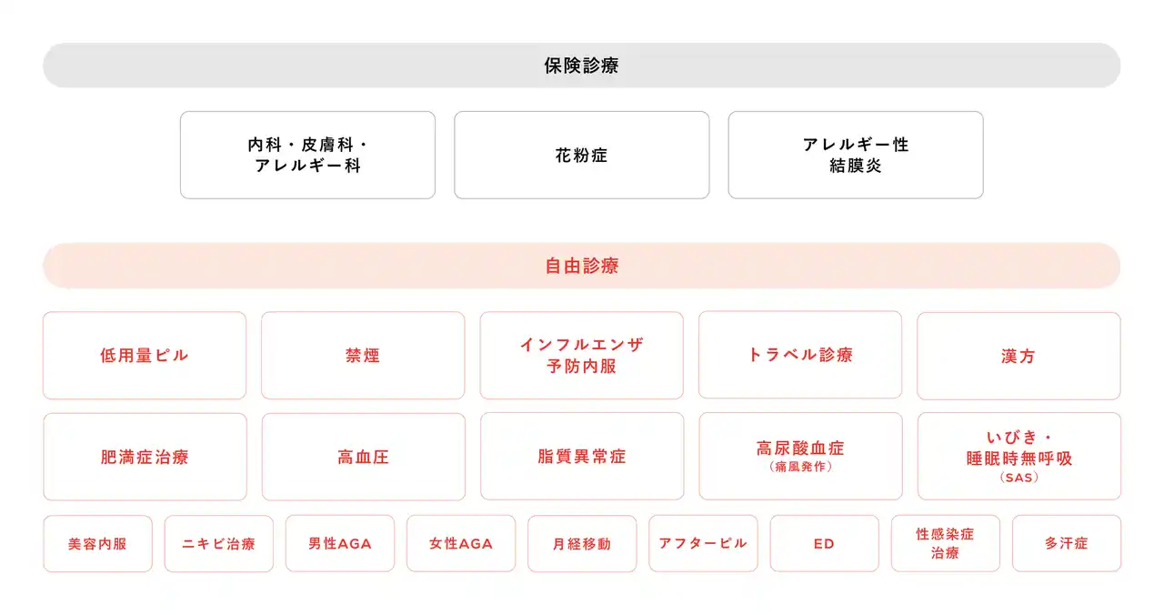 対面診療とオンライン診療を組み合わせたハイブリッド型の医療体制を通じて、保険診療と自由診療の両方に対応。ひとつの症状にとどまらず、疾患を横断して患者さまの悩みに深く向き合う「総合診療」を提供しています。 |