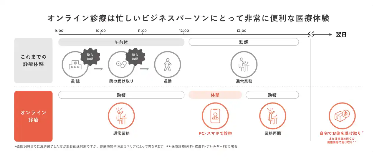 オンライン診療は、忙しく時間のない中でもスキマ時間に診療を受けられるため、ビジネスパーソンにとって非常に便利な医療体験になっています。 |