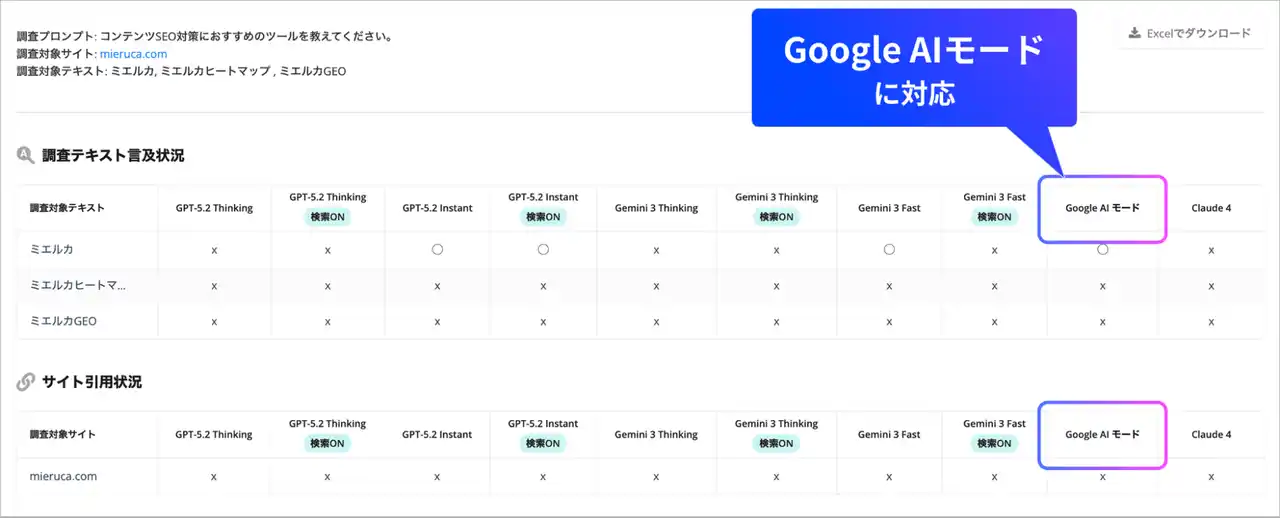 調査対象として、新たに以下の検索機能を追加しました。これにより、Chat GPTやGeminiといった会話型AIに加え、Google AIモードにおける自社・競合の言及・引用状況を手間なく確認することが可能です。 |