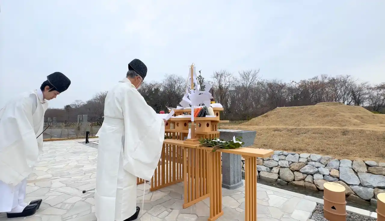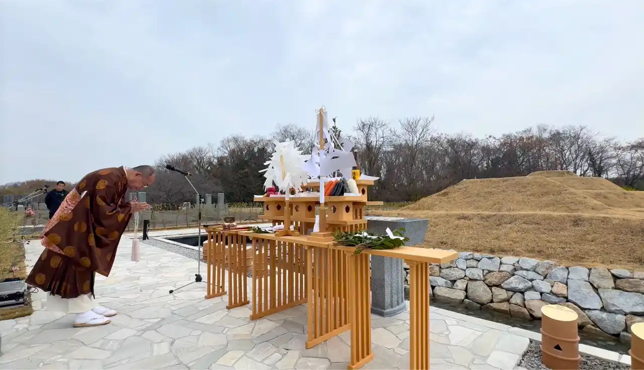 今回の御霊祭で最も象徴的だったのは、神道の聖域である鳥居の前で、仏教の僧侶が恭しく玉串を捧げられた瞬間です。「前方後円墳」という日本古来の形を象徴とする場所だからこそ実現したこの光景は、宗派の垣根を超え、大切な人を偲ぶ純粋な「祈り」の場として、参列者の心に深く刻まれました。 |