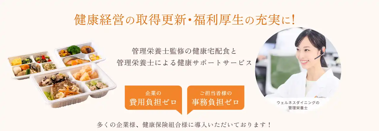 また、当社は従業員の健康をサポートする「食に関する福利厚生」を検討されている企業様への支援にも力を入れています。社員の食生活をサポートすることは、従業員エンゲージメントの向上、生産性向上、さらには健康経営の実現にも貢献すると考えられます。ウェルネスダイニングは、新社会人を含む全ての従業員が安心して働ける環境づくりを、食の側面から企業と共に支えてまいります。法人提携・パートナーシップにご興味のある企業様は、ぜひお問い合わせください。 |