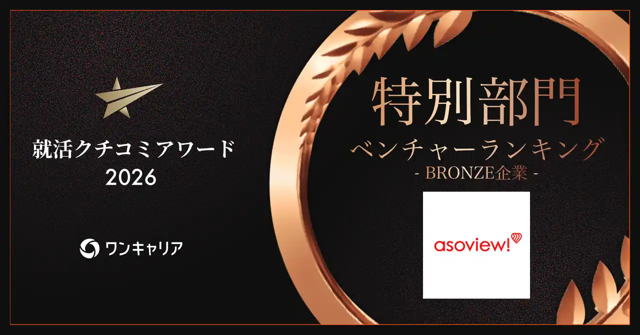 「生きるに、遊びを。」をミッションとし、「遊び」が衣食住に並ぶ人生を彩る豊かなものとして、Well-Beingな社会の実現を目指すアソビュー株式会社(所在地:東京都品川区、代表執行役員CEO:山野智久、以下、当社)は、株式会社ワンキャリアが発表した「ワンキャリア 就活クチコミアワード2026」ベンチャーランキングにおいて、ブロンズ賞を受賞いたしました。 |