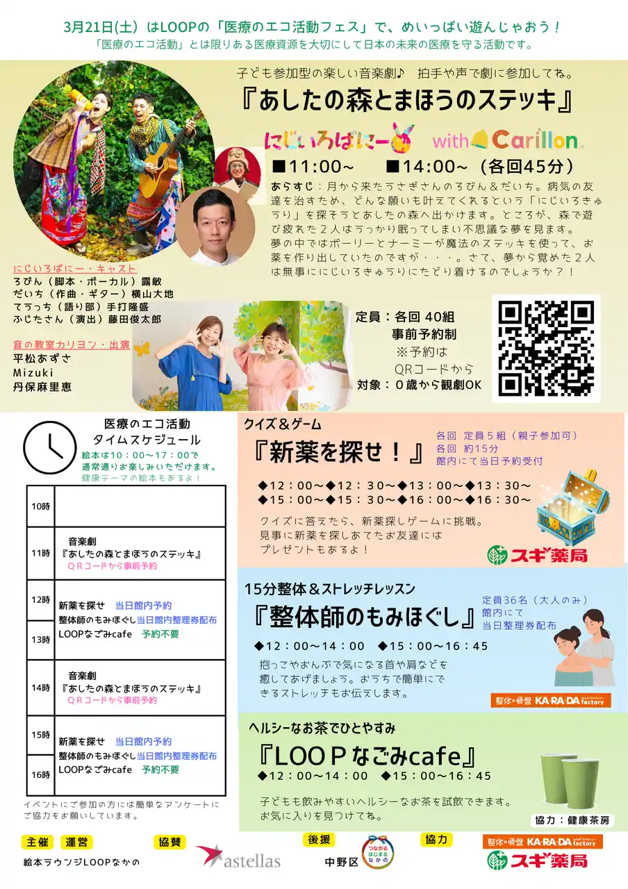整体×骨盤サロン「カ・ラ・ダ ファクトリー」(以下 カラダファクトリー)を展開する株式会社ファクトリージャパングループ(本社:東京都千代田区、代表取締役社長:春名秀樹、以下 ファクトリージャパン)は、2026年3月21日(土)に、東京都中野区で行われた絵本ラウンジLOOPなかので開催されたイベント「第3回 医療のエコ活動フェス みんな元気にな~れ!」(以下、本イベント)に出展いたしました。 |