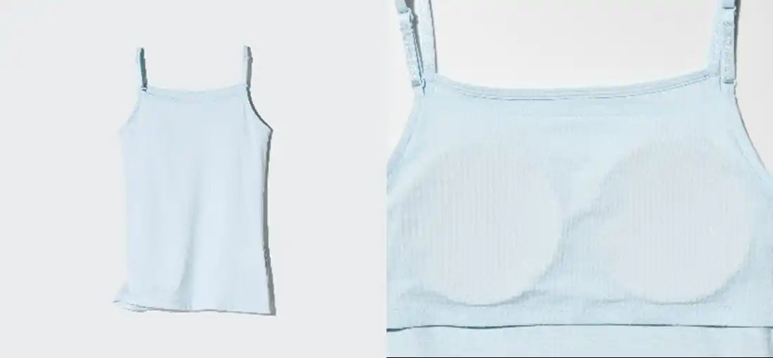 「エアリズムコットンブレンドキャミソール胸二重」は、気になりはじめたバストが透けにくいようサポートします。二重になっている生地がふくらみはじめたバストトップをやさしくカバー。肌あたりのなめらかな「エアリズム」とコットンをブレンドした生地は、吸湿・放湿、ドライ、接触冷感、抗菌防臭、消臭機能付き。 |