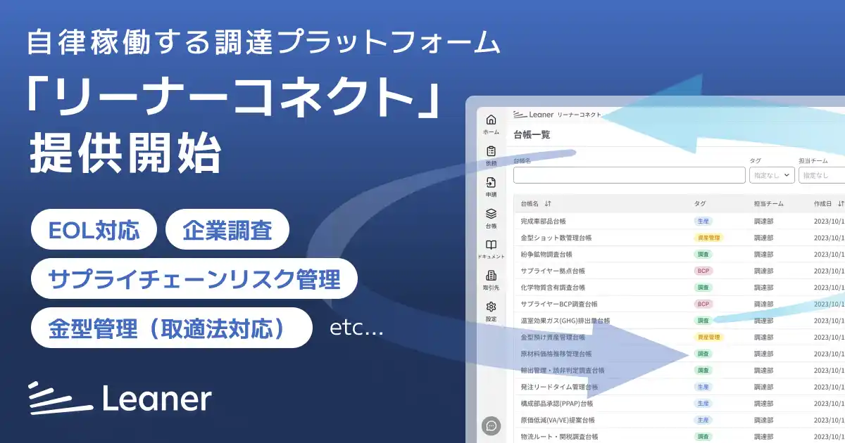 「調達のスタンダードを刷新し続ける」をミッションに掲げる株式会社Leaner Technologies(本社:東京都品川区、代表取締役CEO:大平 裕介、以下「リーナー」)は、サプライヤーとの情報管理とコミュニケーションを一元化・自動化する次世代型プラットフォーム「リーナーコネクト」の提供を開始いたします。