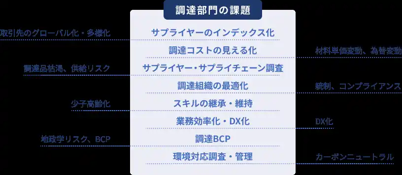 脱炭素(カーボンニュートラル)への対応、人権デューデリジェンス、頻発する災害へのBCP対策、そして2026年1月施行の「取引適正化法」への準拠など、外部環境の変化により、調達部門が処理すべき情報量は近年、爆発的に増加しています。 |