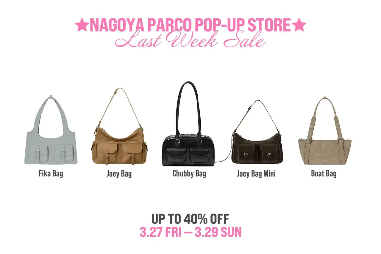 3月7日より開催中の名古屋ポップアップでは、3月27日~29日の最終3日間限定で、ラストウィークセールを実施いたします。本セールでは、名古屋ポップアップで展開していなかったラインナップをご用意しており、「チャビーバッグ」や「ジョイバッグミニ」など、スタンドオイルの定番人気アイテムを最大40%OFFの特別価格でお買い求めいただけます。 |
