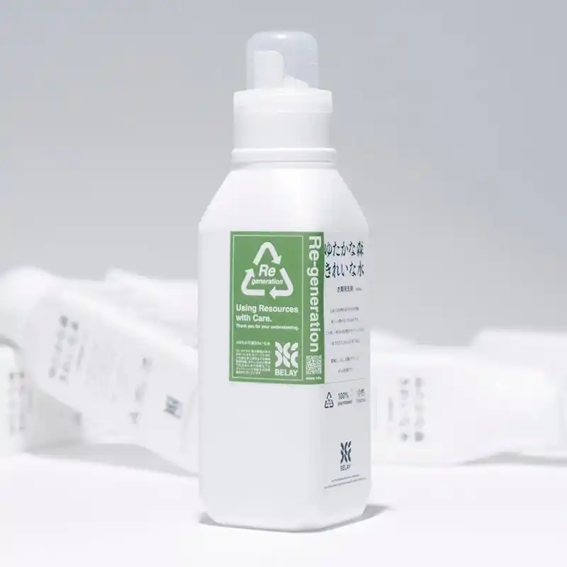 BELAYは「使用済み容器は、廃棄物ではなく貴重な資源である」という考え方に基づき、「廃棄ゼロ」を目指し、回収した使用済みボトルに新しい洗剤を充填しRe-generation(再生)ボトルとして販売しています。 |