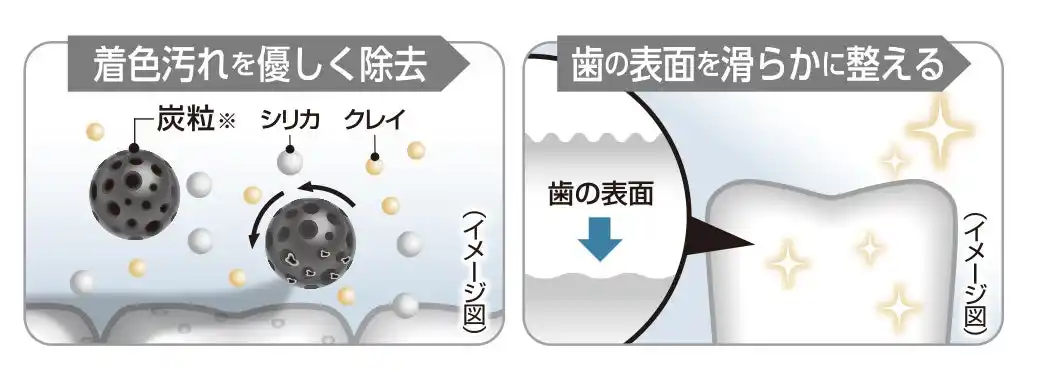 『スミガキ』の代名詞である炭に加え 、粒子の細かい「クレイ*²」を新たに配合しました。大きさの異なる清掃成分を組み合わせることで、歯の表面にある目に見えない細かな凹凸にまで入り込み、蓄積した着色汚れを効率よく除去します。こだわりの配合バランスにより歯の表面をなめらかに整えます。また、炭粒*¹ならではの“しゃりしゃり”とした心地よい清掃実感とともに、磨き終わりの“つるつる感”を叶えるこだわりの使用感も追求しました。 |