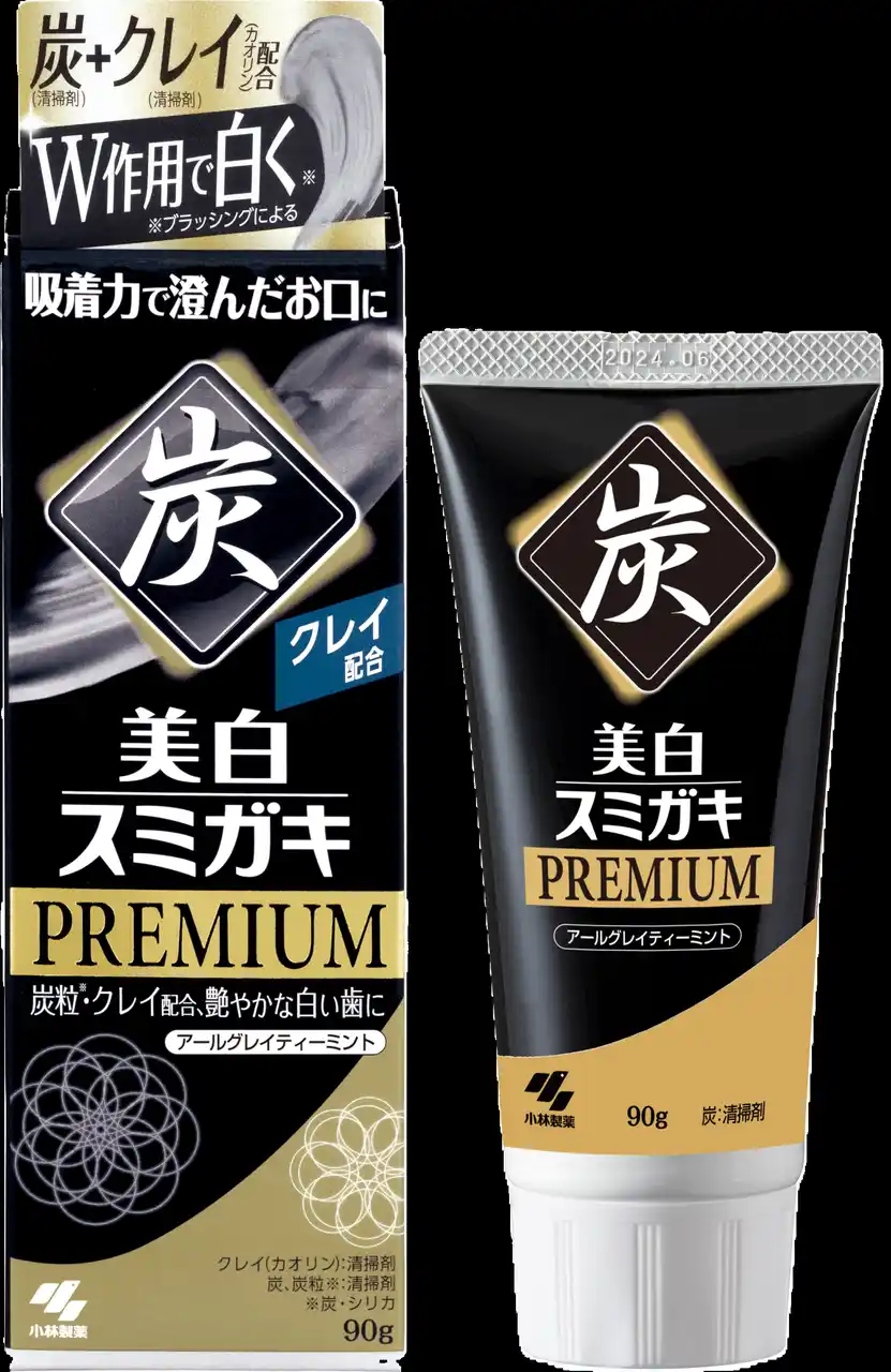 今回発売する「美白スミガキプレミアム」は、強みである炭*¹の清掃力に、新たにクレイを掛け合わせたW配合の自信作です。 |