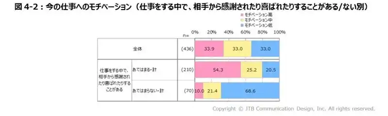 また、「今の仕事に、私の知識や能力、経験が活かせている」または「仕事をする中で、相手から感謝されたり喜ばれたりすることがある」と回答した層のモチベーションは、あてはまらない層に比べて高く、自身のスキルが活かせることや、周囲からの感謝がモチベーションに関係する可能性が示されています(図4-2)。 |