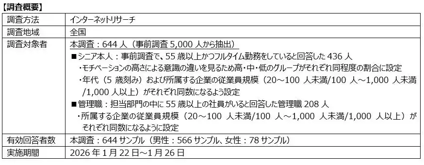 本調査は、シニア本人を対象とした調査とシニアを部下に持つ管理職を対象とした調査の2つで構成されます。それぞれの結果を「働くシニアのモチベーションの現状」および「上司からみたシニアのモチベーション」として提示します。