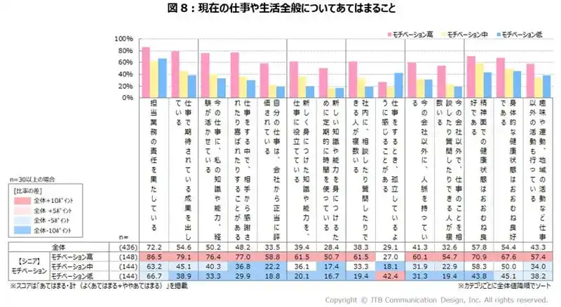 さらには、「精神面での健康状態はおおむね良好である」「身体的な健康状態はおおむね良好である」などの心身の健康や、「趣味や運動、地域の活動など仕事以外の活動も行っている」といった私生活に関する項目でもモチベーションの高さによる違いが見られ、生活全般において差異があることが示されました(図8)。 |