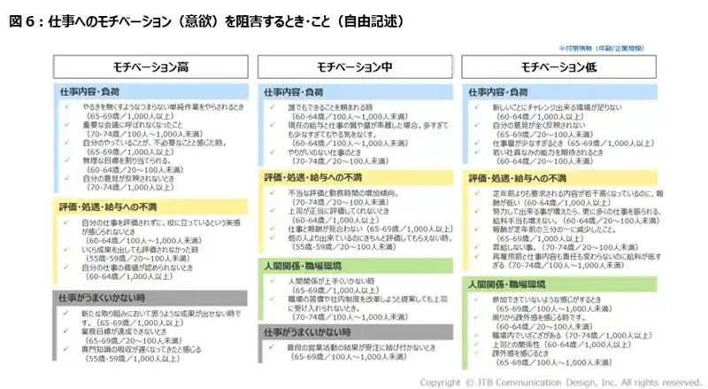 6. シニアのモチベーションを低下させるのは単純作業/評価への不満/人間関係 モチベーションが中~低い層は処遇への不満や疎外感などが低下の要因に |