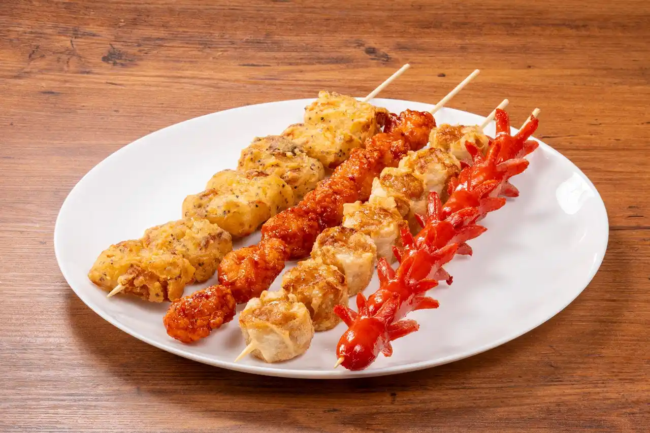 タコさん串、シュウマイ串、ヤンニョムチキン串、スパイシーちくわ天ぷら串の4本セット |