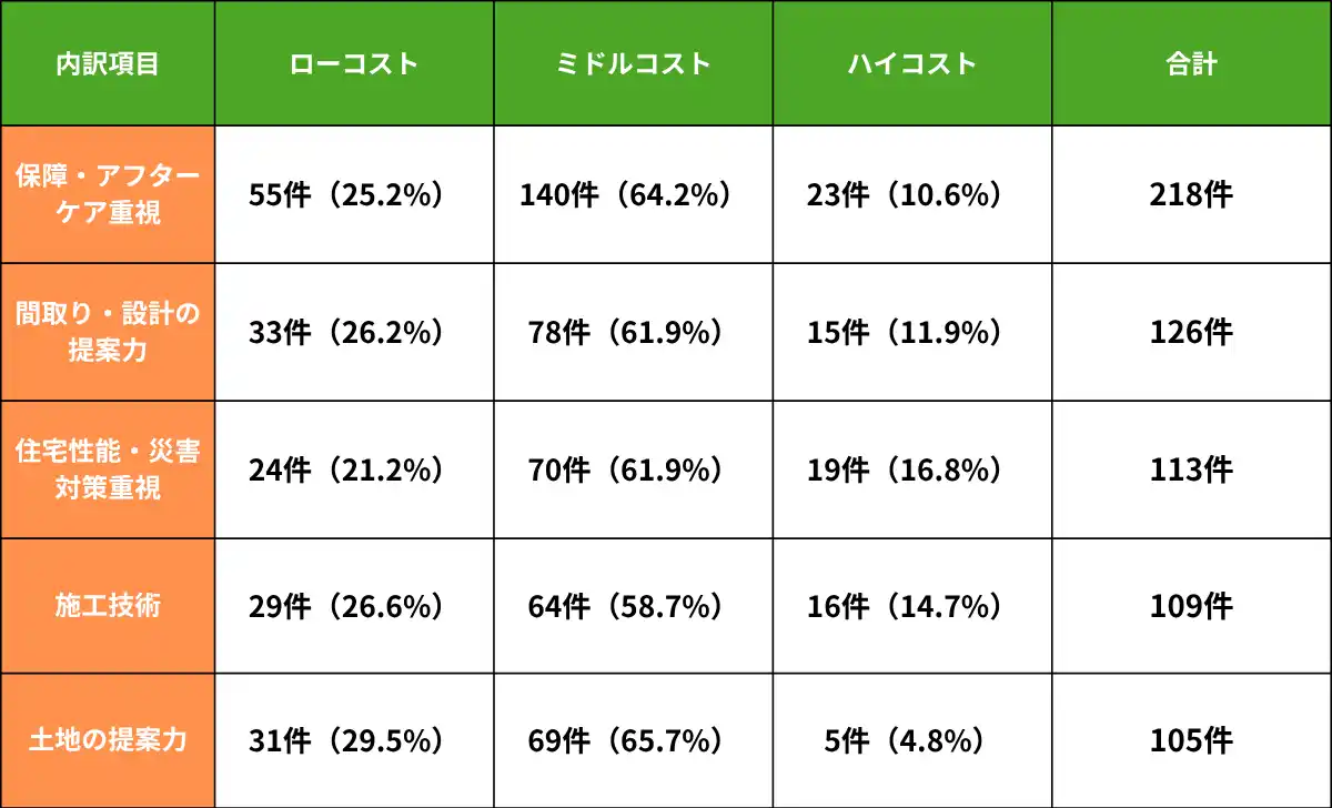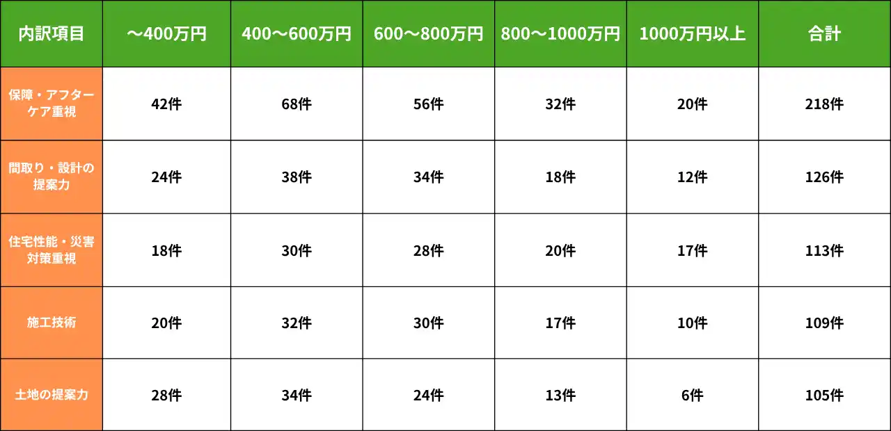 ・一方、建物本体価格2,000万円以下を希望するローコスト提案の層では、「保証・アフターケア」や「施工技術」など、安心して任せられる信頼性やコストバランスを重視する傾向が見られました。限られた予算の中でも、将来的な安心やリスク回避を重視する志向がうかがえます。 |
