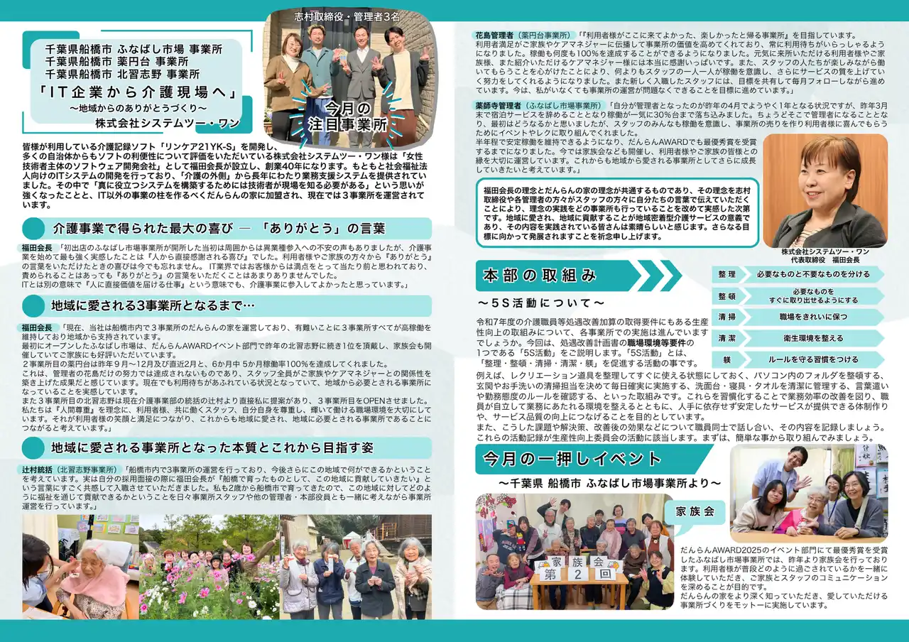 | 今号の特集では、千葉県船橋市で「だんらんの家」3事業所を運営する株式会社システムツー・ワンにフォーカス。もともとは介護記録ソフトの開発で長年、福祉を外側から支えてきたIT企業が、なぜ介護の現場へと踏み出したのか。そして、なぜ今、地域から深く信頼される事業所へと成長しているのか――。そこにあったのは、数字や仕組みだけでは語れない、「ありがとう」の力でした。 | |||