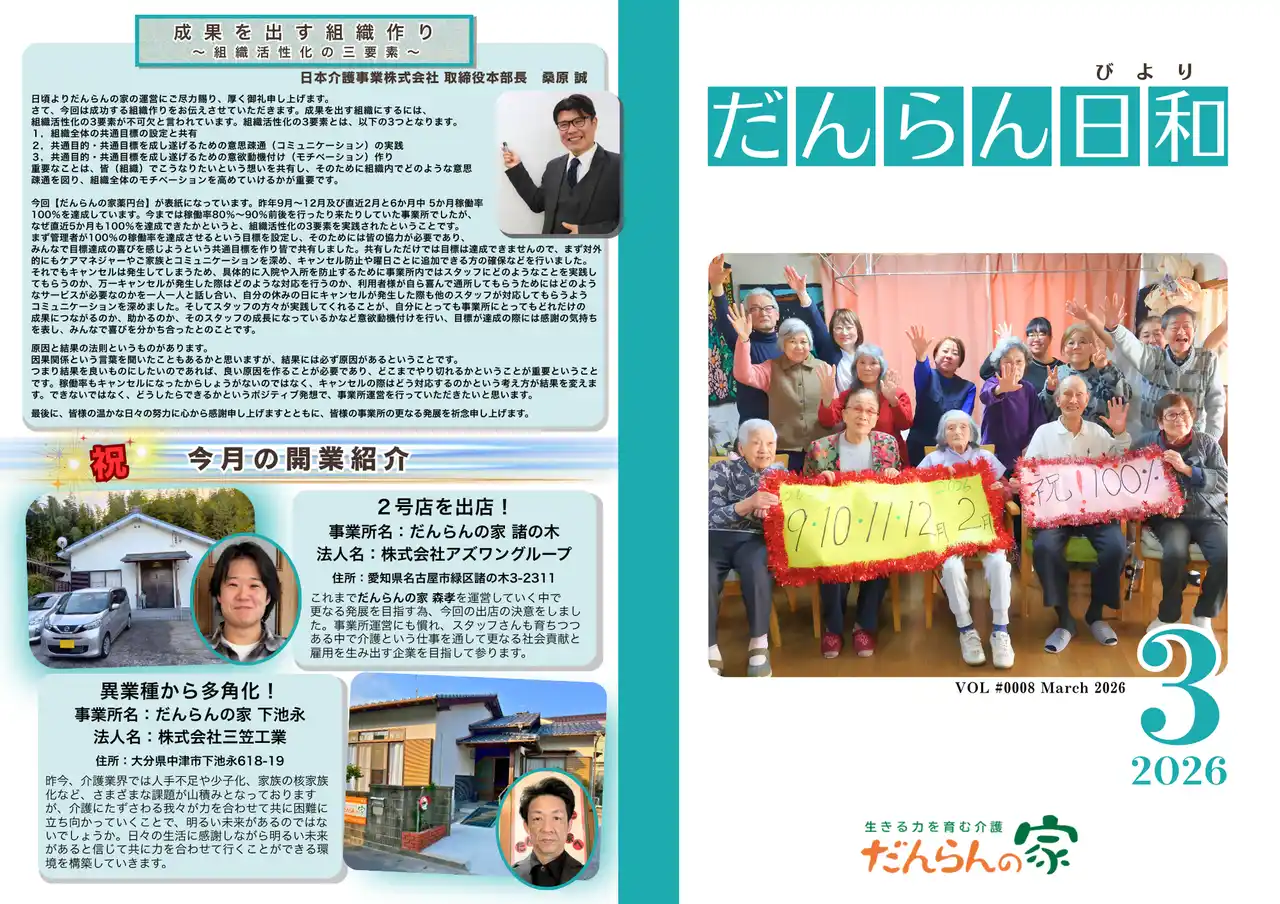 | 日本介護事業株式会社(本社:東京都墨田区/以下、日本介護事業)は、フランチャイズブランド「だんらんの家」の広報誌『だんらん日和』3月号を発刊しました。 | |||