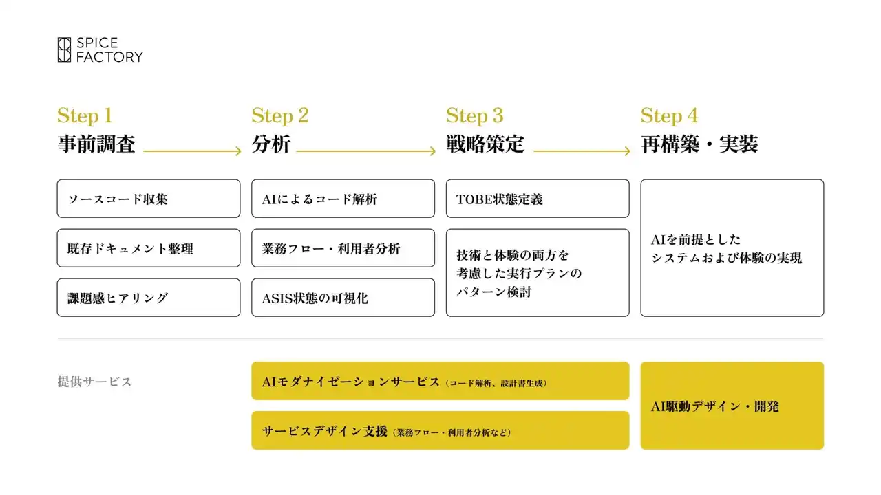 デジタル・トランスフォーメーションを支援するスパイスファクトリー株式会社(本社:東京都港区、代表取締役CEO:高木広之介、以下「当社」)は、レガシーシステムの構造・課題をAIで可視化し、AI活用に適した次世代基盤への再構築までを一貫して支援する「AIモダナイゼーション支援サービス」の提供を開始しました。 |