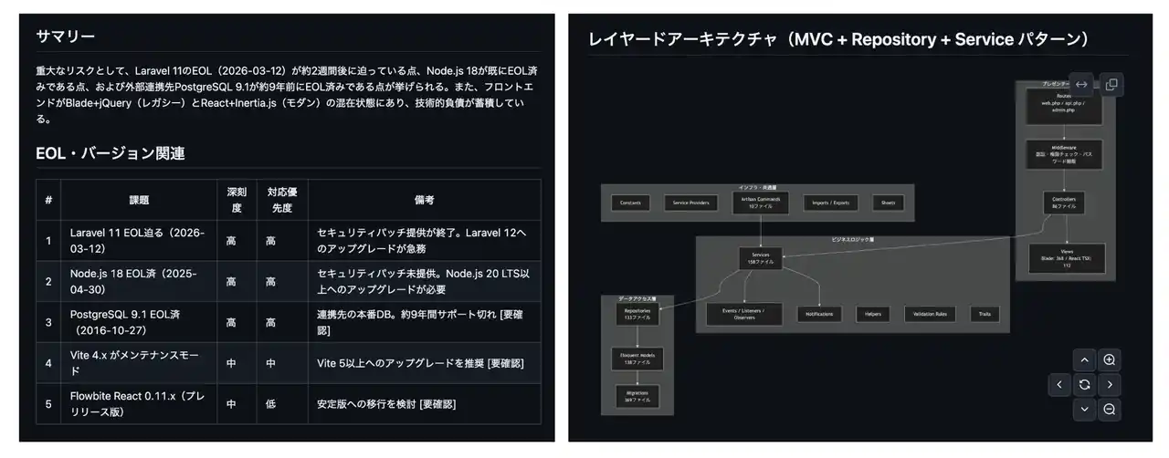 左:AIによるコード解析結果のサマリー(EOL・リスクの可視化)右:AI解析によるアーキテクチャ可視化と再設計イメージ |