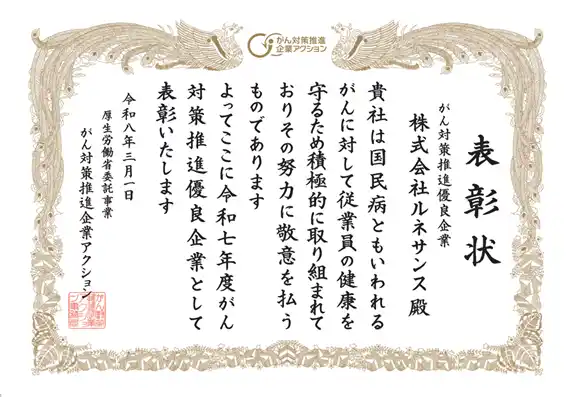 株式会社ルネサンス(代表取締役社長執行役員:望月 美佐緒、本社:東京都墨田区、以下「当社」)は、厚生労働省が推進する「がん対策推進企業アクション」において、令和7年度「がん対策推進優良企業」として表彰されました。当社の受賞は今回で3回目となります。当社は、検診受診状況や精密検査受診状況を把握・フォローする仕組みの整備に加え、従業員一人ひとりの状況に応じた支援体制を構築してきた点が評価されました。 |