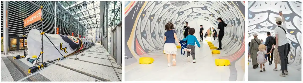 色鮮やかな友禅染めのこいのぼりは、直径約2.5メートル、全長約25メートルと迫力満点。トンネルのような内部空間では、子どもたちが走り回りながら楽しむ姿も見られ、会場は笑顔であふれます。普段は見上げて鑑賞するこいのぼりを“くぐる”体験を通して、遊びながら日本の伝統文化に親しめる、ゴールデンウィークならではの特別なひとときを提供します。 |