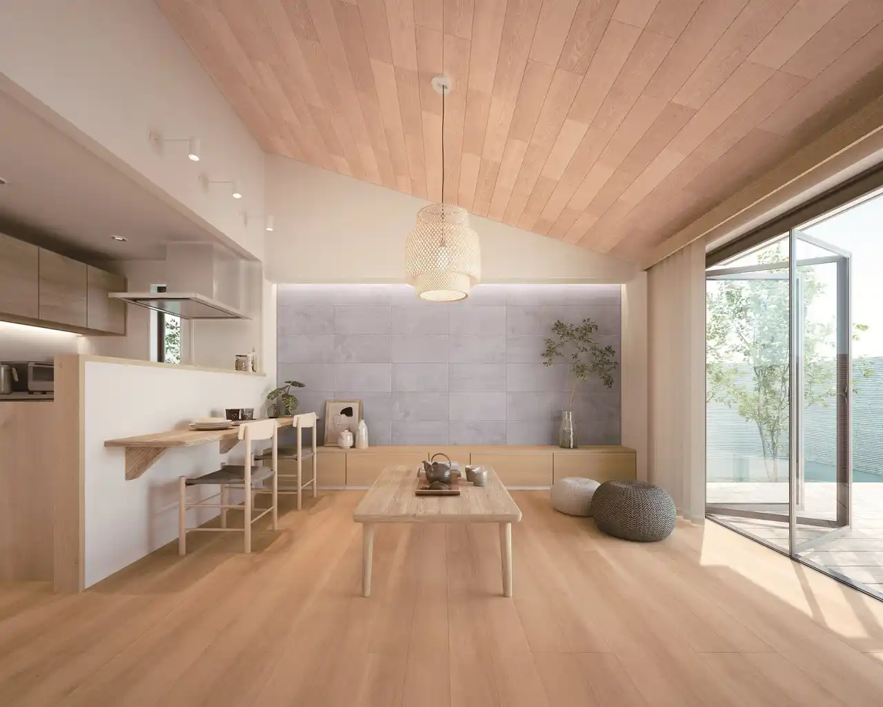 調湿・消臭建材『エアセレーノ』を天井と壁の一部に使用した空間イメージ |