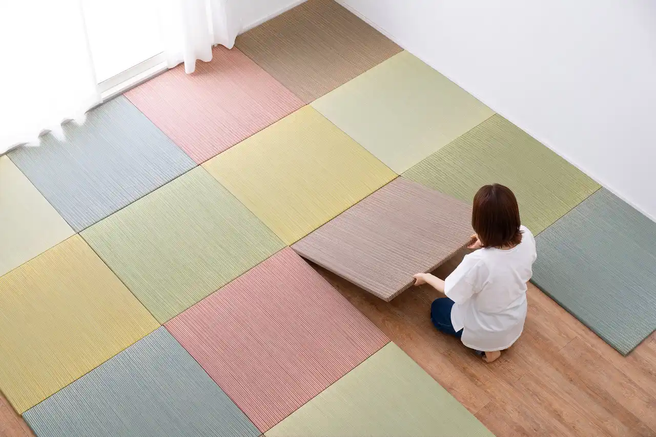 置き畳は、フローリングの上に“置くだけ”で簡単に和の空間を作り出せる畳で、施工工事を必要とせず、必要な分だけ自由にレイアウトできるのが特徴です。1枚単位で敷いたり外したりできるため、ライフスタイルやシーンに応じた柔軟な使用が可能です。置き畳の主な魅力を以下にご紹介いたします。 |